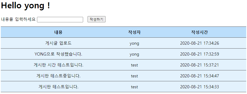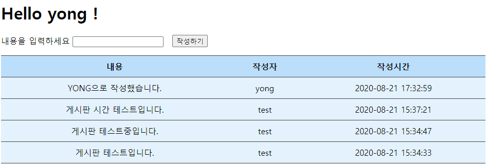 게시판에서는 내용과 작성자, 등록 시간을 볼 수 있다.